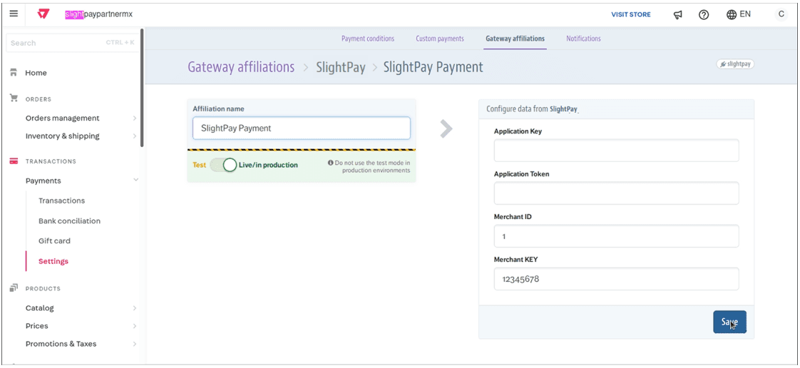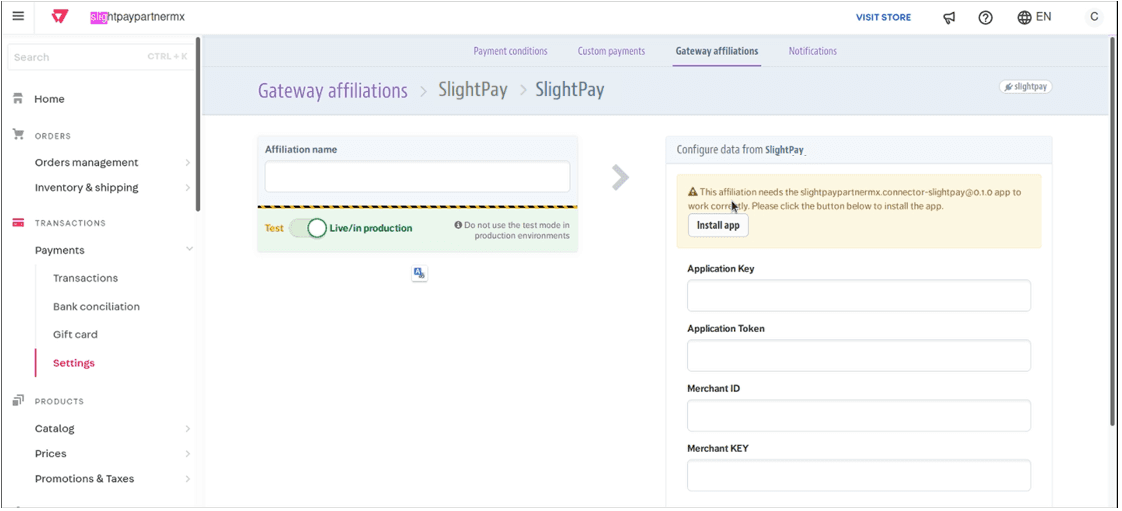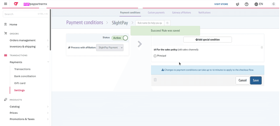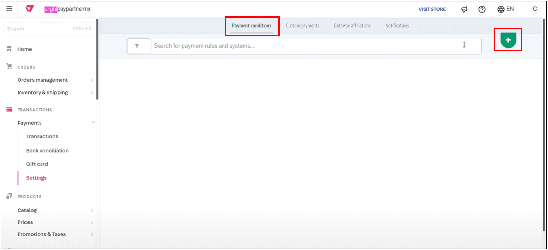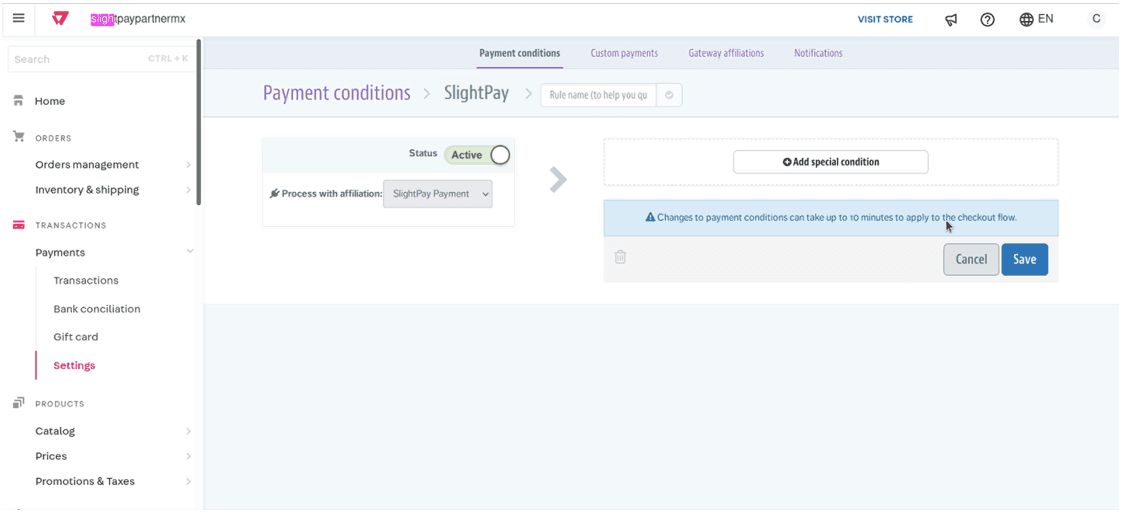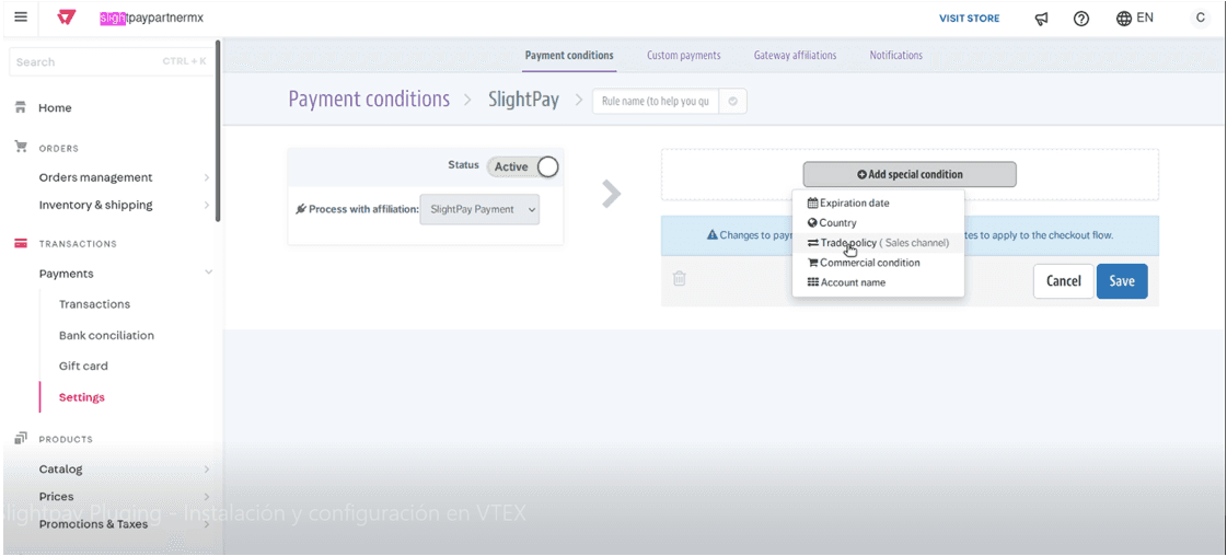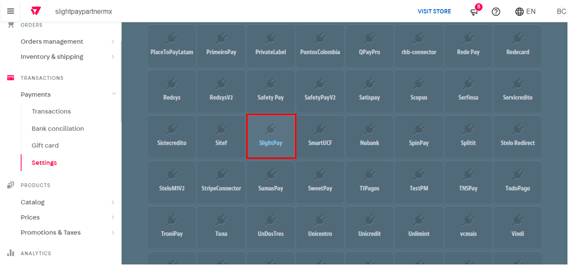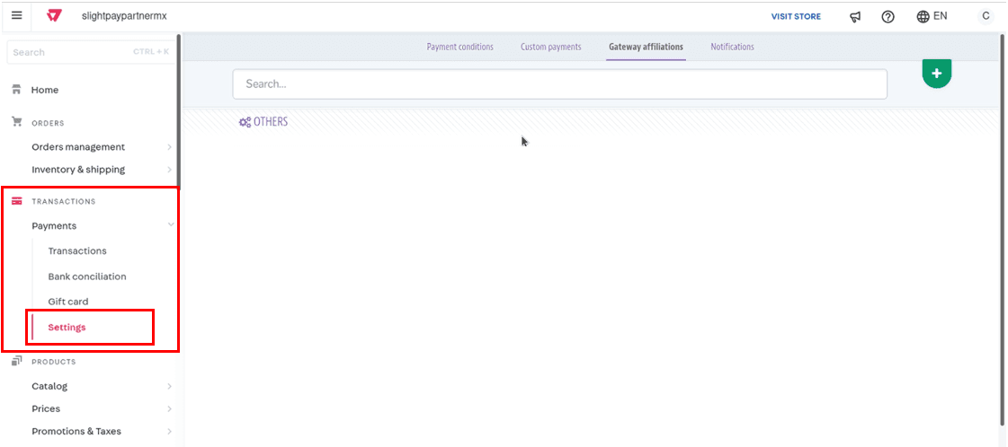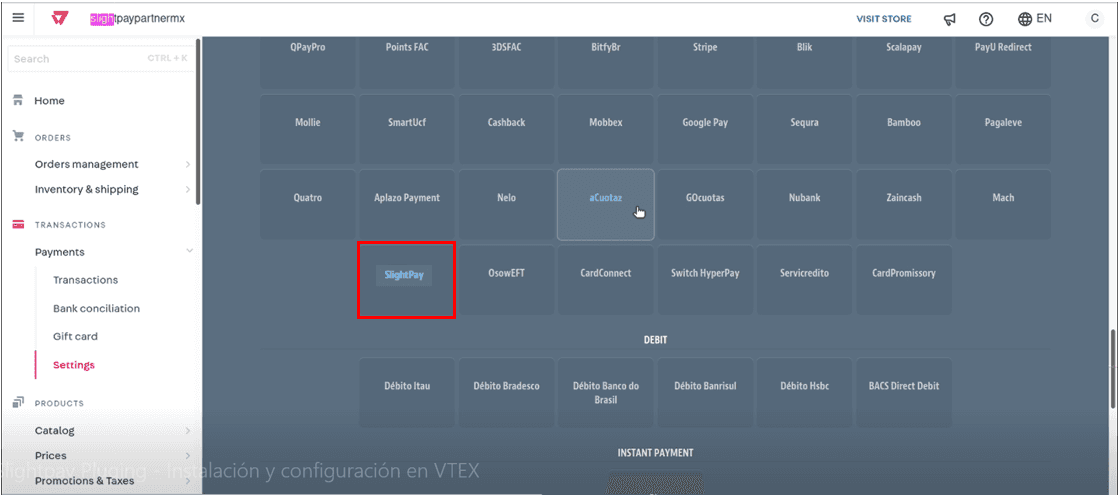 Paso 1: Desde tu Dashboard de administración de VTEX selecciona en el menú lateral izquierdo el submenú [Transactions/Settings]