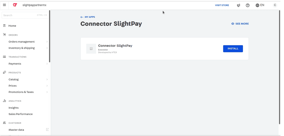 Paso 4: Al cargar la siguiente pantalla, presiona en el botón [Install App] donde se te solicitará el inicio de sesión en tu cuenta de VTEX.