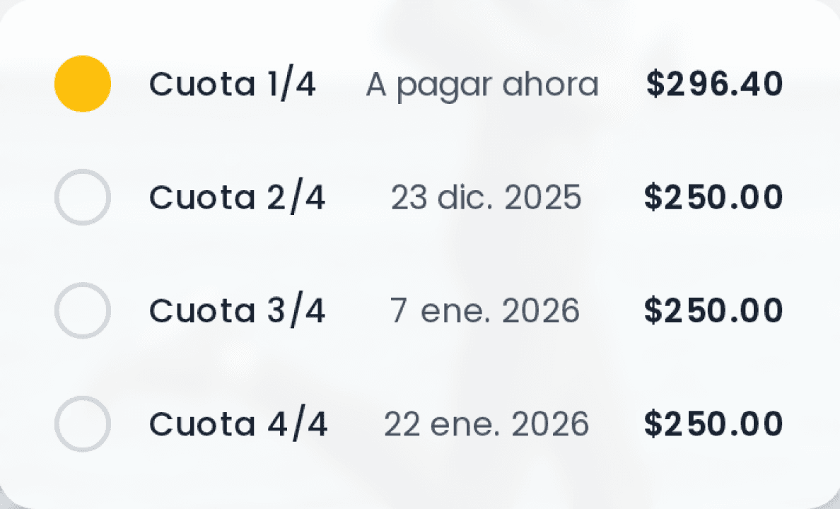 Disfruta más y mejor de tu dinero dividiendo los pagos de tus compras. Compra hoy y paga hasta en 4 cuotas. Sin sorpresas a final de mes y con mayor control de tu presupuesto.